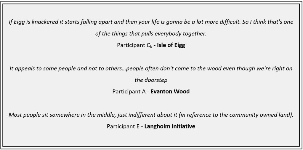 While communities engaged with the land in a variety of similar ways, through school groups, volunteer work, and recreation, a deeper interrogation reveals that the motivations underpinning this participation varied dramatically. On the Isle of Eigg, socio-ecological engagement was consistently framed as a matter of existential necessity. The island’s geography and inherent vulnerability meant that active participation was a reciprocal obligation, essential for collective survival. This motivation contrasts sharply with the mainland sites. There, while reciprocity was also mentioned – individuals ‘get something back from it’ – participation remained a choice, driven by a desire for ecological or social benefits rather than a prerequisite for the community’s basic functioning.